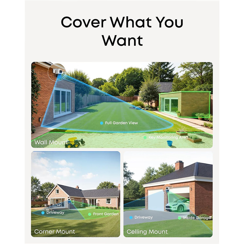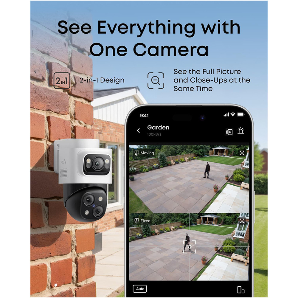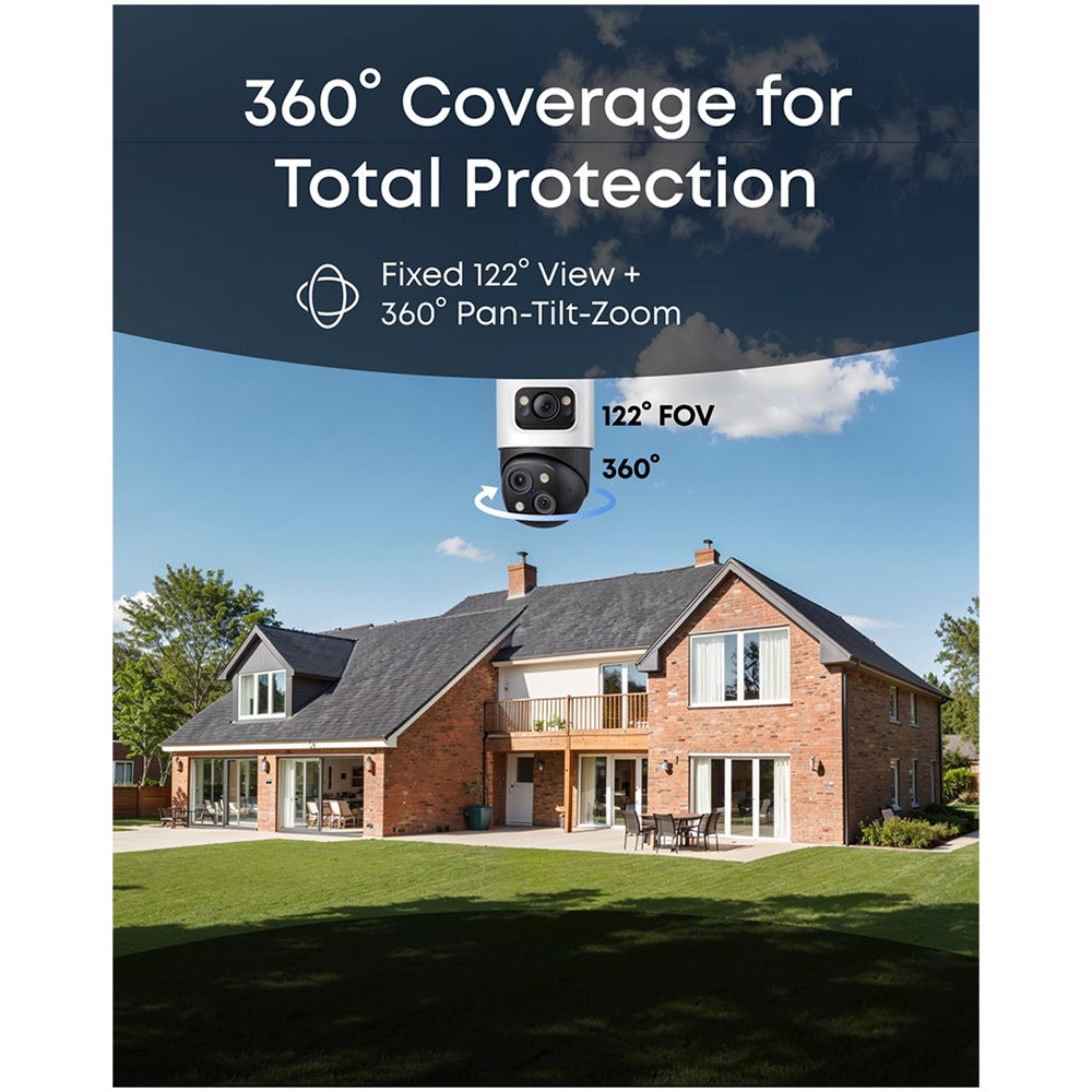• 2-in-1 Triple-Lens Design: Upper 4K wide-angle camera (122° view) + lower 2K Pan-Tilt-Zoom (8× auto-zoom, 360° pan)