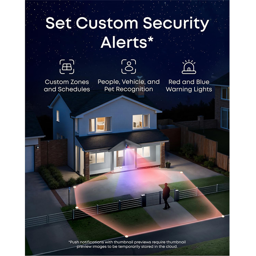 • Red & Blue Warning Lights: Smart sirens and strobe lights deter intruders