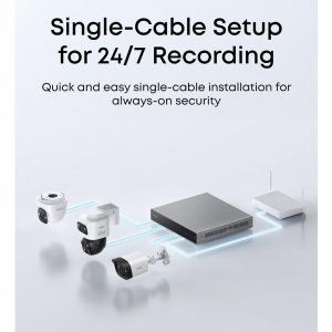 • 24/7 Recording with PoE: Single cable handles power and data; PoE NVR, switch, injector, and DC adapter required (not included)