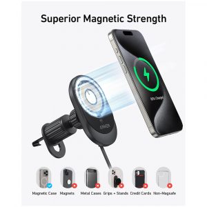 The Anker MagGo Wireless Car Charger is a powerful and convenient in-car charging solution designed for modern smartphones. With Qi2-certified wireless charging, it delivers fast, safe power while keeping your device secure on the road. Its 360° adjustable magnetic mount ensures the perfect viewing angle, while the strong magnetic grip keeps your phone stable even on rough drives. Built with advanced cooling technology and premium materials, it offers efficient performance, durability, and a seamless driving experience.