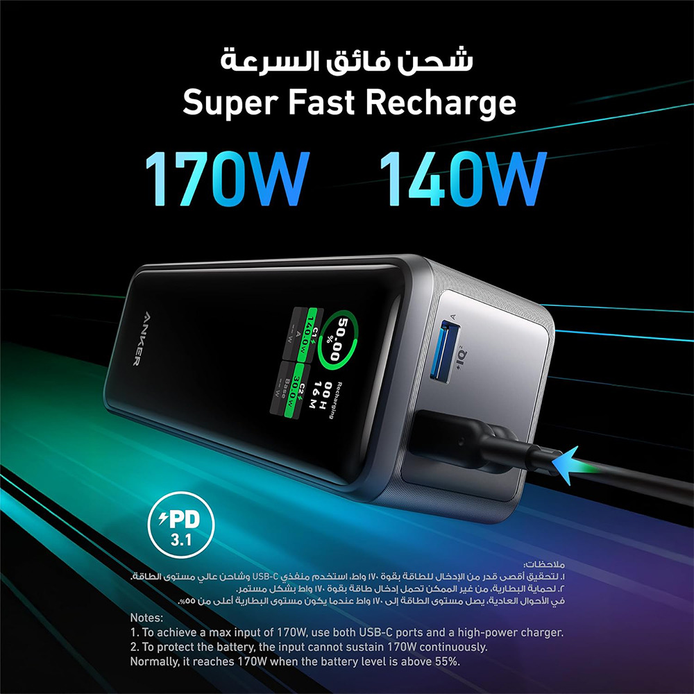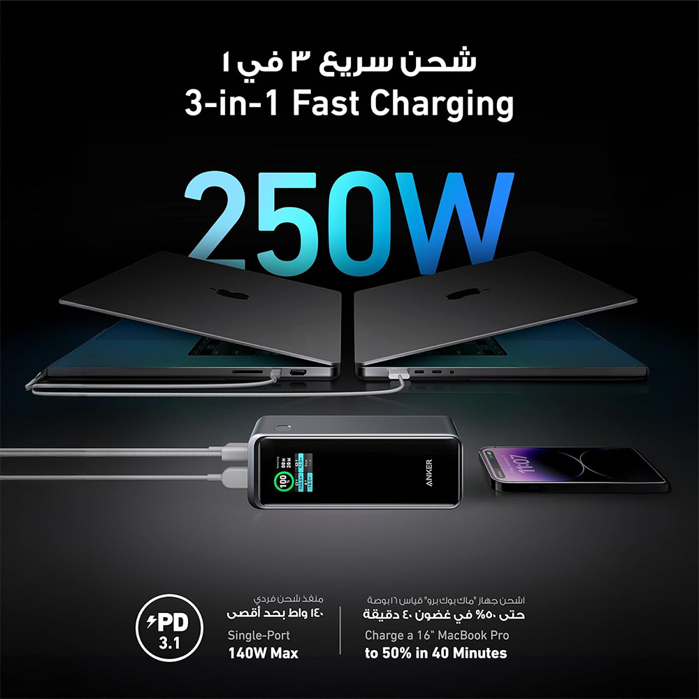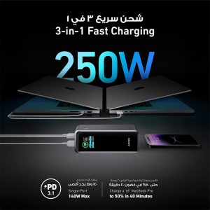 With 250W ultra-fast charging support, it can power laptops, smartphones, and tablets efficiently. The device features a digital display,