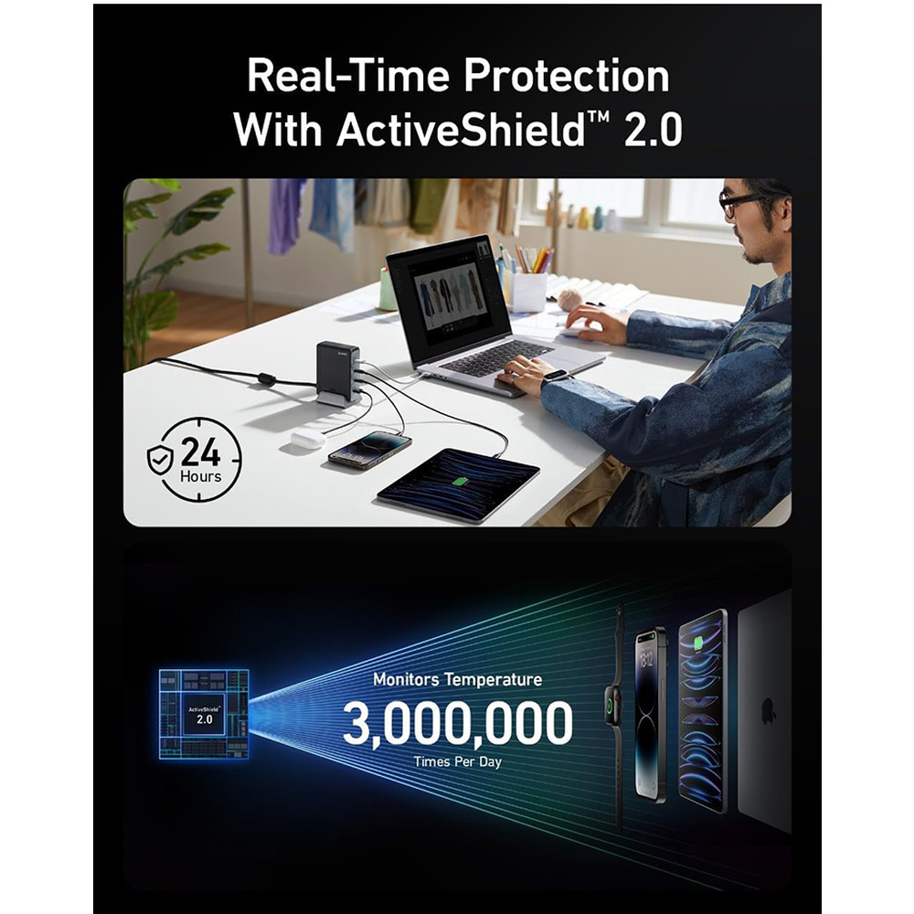 The Anker 240W GaN USB-C Charger is a powerful, high-speed charging solution designed for multiple Apple and other devices. With one USB-C port delivering up to 140W and three additional ports sharing 100W, it enables fast simultaneous charging of up to four devices. Featuring Anker’s advanced GaNPrime technology and ActiveShield™ 2.0 for real-time temperature monitoring, it ensures safe and efficient charging. Its sleek, skin-friendly finish and compact design make it ideal for desk use or travel.