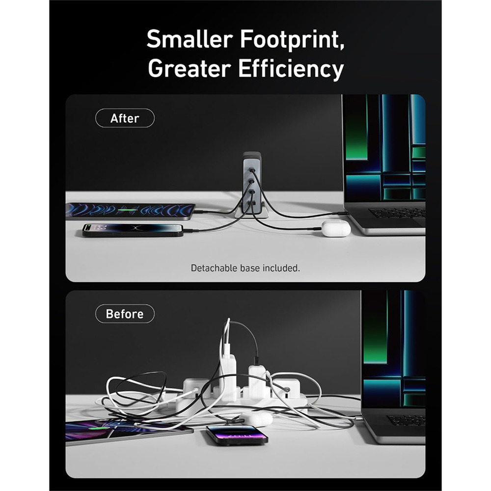 • Compact design with detachable base for clutter-free workspace