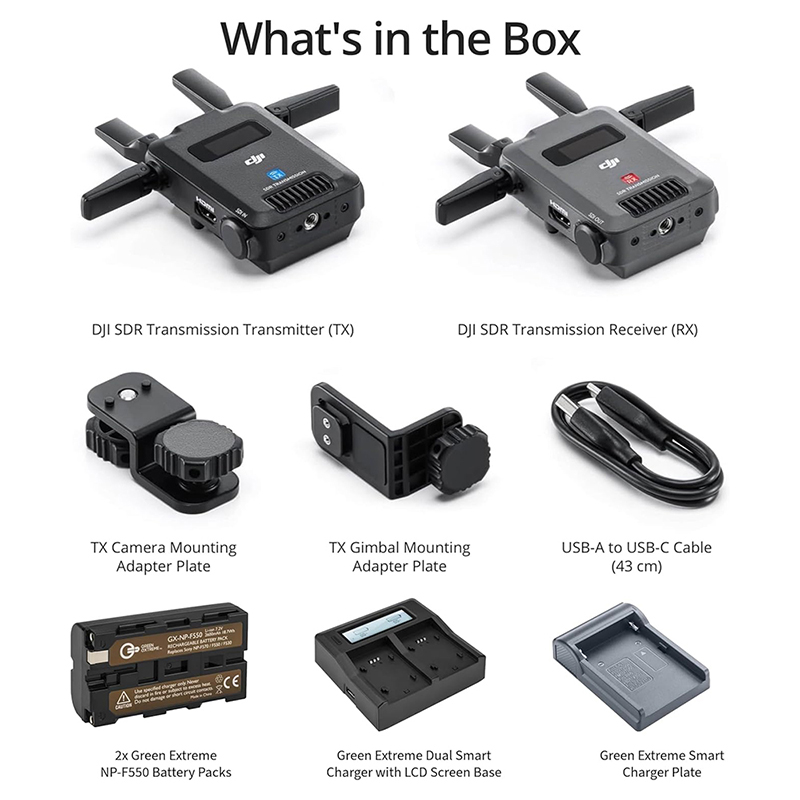 • Includes: SDR Transmission Transmitter (TX) | SDR Transmission Receiver (RX) | USB-A to USB-C Cable (43cm) | TX Camera Mounting Adapter Plate | TX Gimbal Mounting Adapter Plate | DJI 1 Year Limited Warranty | 2x Green Extreme NP-F550 7.2V 18.72Wh Li-Ion Batteries | Green Extreme Dual Smart Charger with LCD Screen Base and Battery Plates