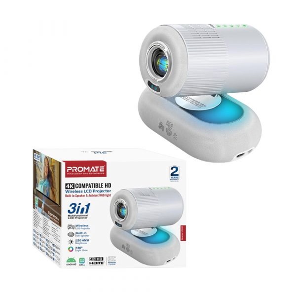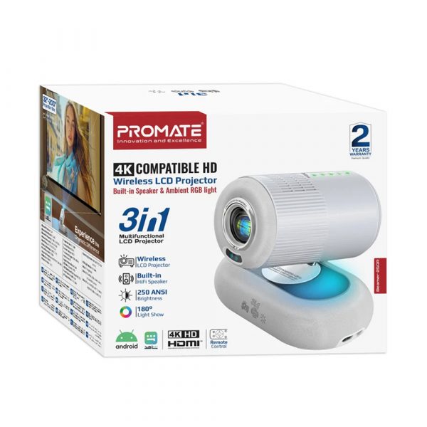 Experience immersive entertainment with Beamer-250R, the ultimate portable 4K-ready wireless LCD projector from Promate. Powered by Android 13 and equipped with LCD 3.0″ LVDS technology, it delivers stunning Full HD native resolution with 4K support. Enjoy vibrant visuals with 250 ANSI Lumens brightness, angle-adjustable projection, and hassle-free auto focus and keystone correction. Whether you’re binge-watching at home, presenting in the office, or hosting outdoor movie nights, Beamer-250R ensures seamless streaming via integrated Wi-Fi, Bluetooth 5.4, HDMI, and USB. The powerful 10W stereo speakers deliver rich sound, enhanced by Bluetooth audio connectivity for wireless speaker pairing. Packed with RGB lighting modes and a user-friendly Bluetooth remote, it adds style and convenience to every viewing experience. Lightweight and compact, Beamer-250R is your versatile entertainment companion.