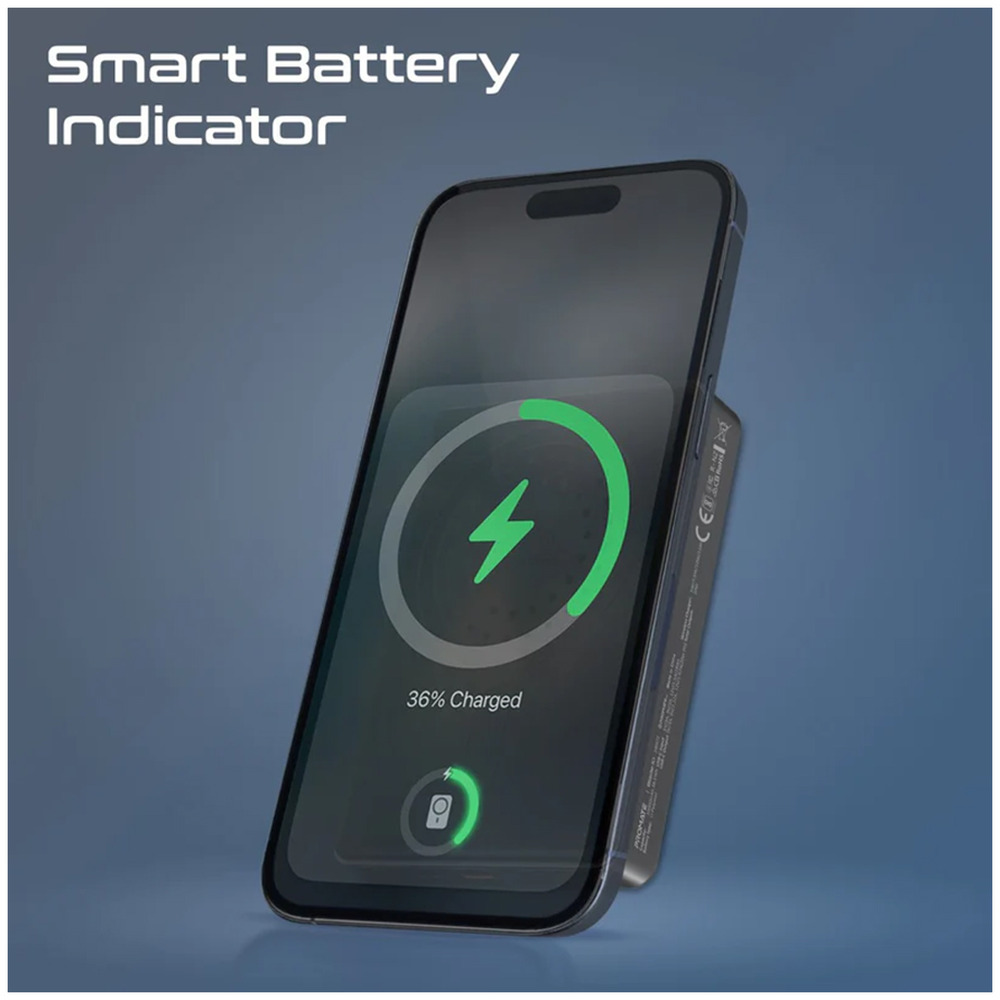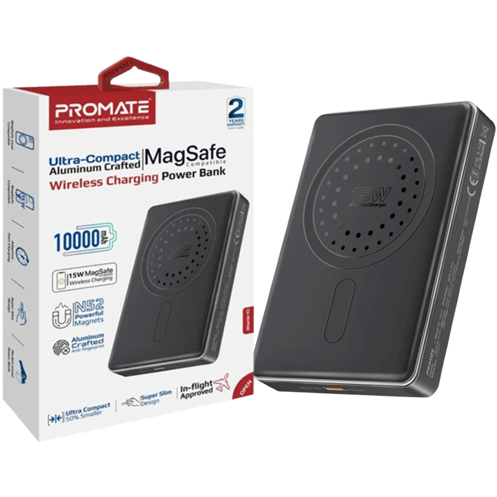 Power up your day with Promate’s Blade-10, a sleek and portable 10,000mAh MagSafe-compatible power bank that provides seamless 15W wireless charging. The ultra-slim unit attaches to your MagSafe compatible smartphone without adding bulk and fits easily into your pocket or bag, making it the perfect travel companion. The USB-C port with 20W Power Delivery ensures fast and efficient charging for all your devices. A smart battery indicator displays two power rings on your phone screen showing the battery levels of both the phone and power bank. Built with durable aluminum and PVC materials, Blade-10 delivers safe, reliable, and convenient power anytime, anywhere.