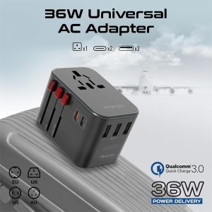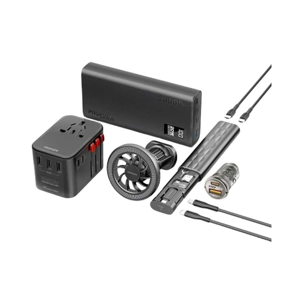 8-in-1 Portable Charging Travel Kit, 20000mAh Power Bank (Bolt-20PD) with Smart LCD Display, 36W Universal AC Adapter (TripMate-36W) compatible with 150+ countries, 65W Dual-Output Mini Car Charger (TransDrive-65W) with USB-C and QC 3.0, Magnetic Clip Mount for secure phone positioning, Built-in USB-C to Lightning Cable (XCord-Ci), Built-in USB-C to USB-C Cable (XCord-CC) with 60W PD support, PERK Accessory Kit with multi-adapters, TF, Micro, and Nano SIM card slots, Durable, stylish, and portable storage case, Universal compatibility across smartphones, tablets, laptops, cameras, and wearables, High-speed charging with PD65W, QC3.0, and multiple output ports, Automatic voltage regulation and multi-protection system for safe charging, Compact and travel-friendly design for effortless portability.