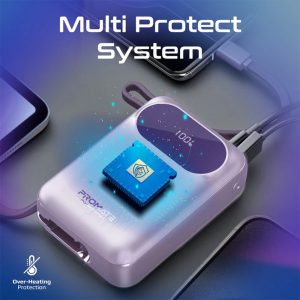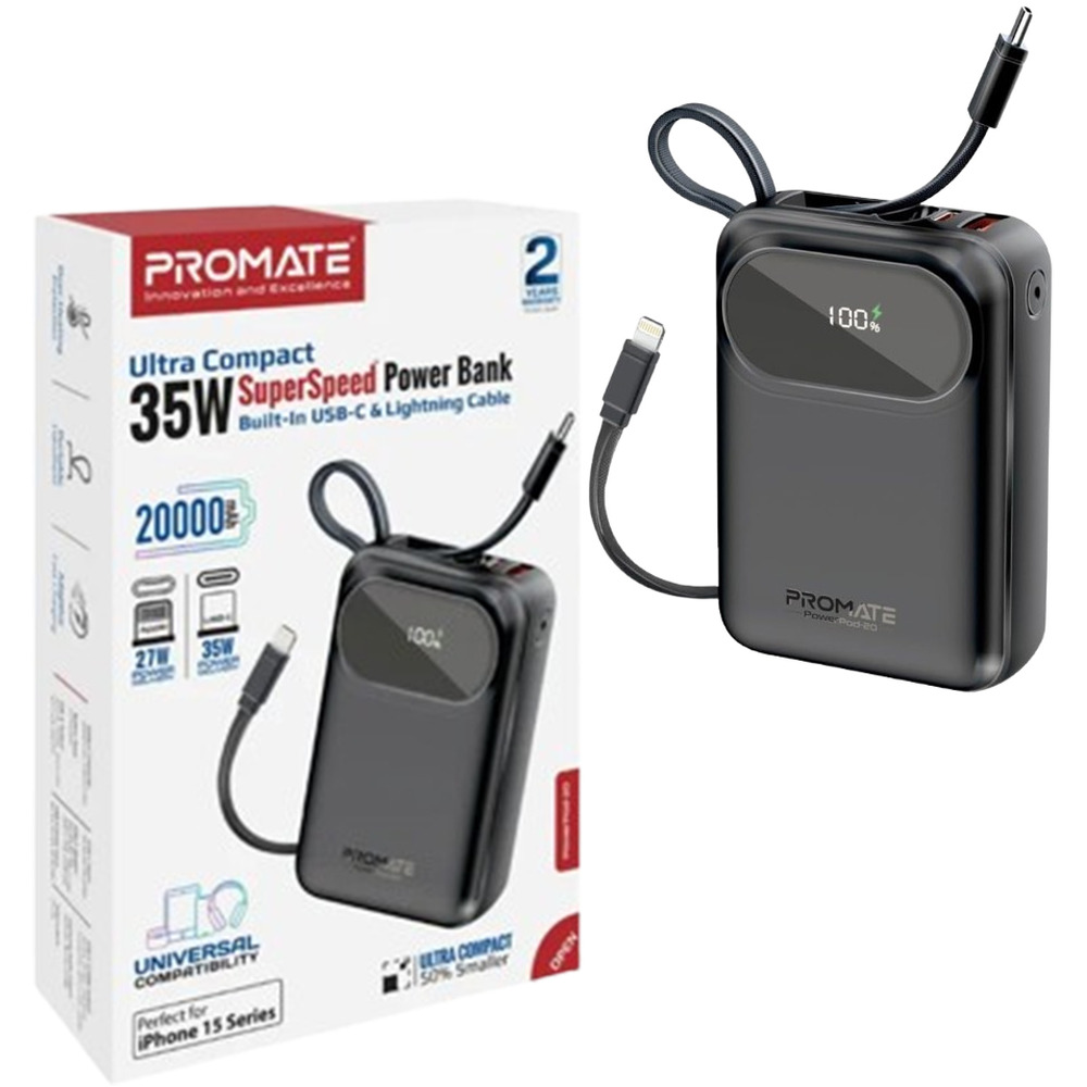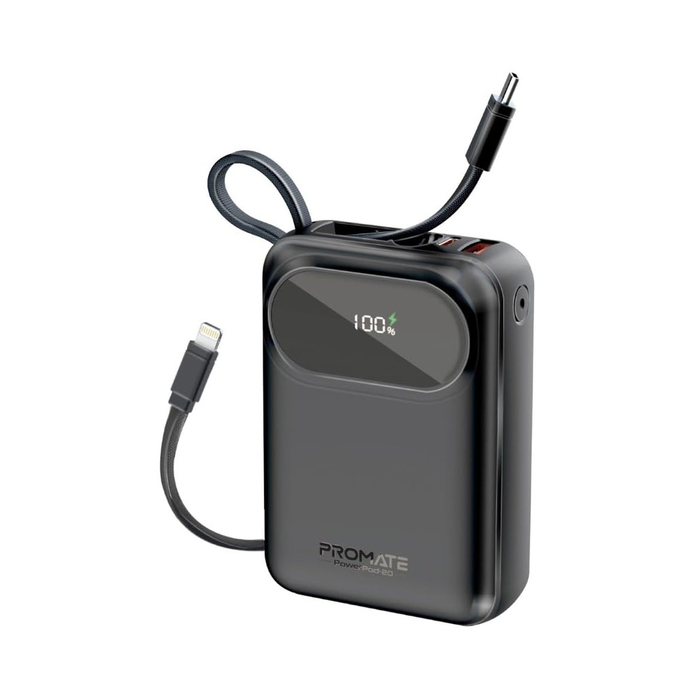 The Promate PowerPod-20 is a high-capacity, ultra-compact 20000mAh power bank designed for convenience and speed. It features built-in USB-C Power Delivery and Lightning Connector cables, eliminating the need for extra cords. With a 35W USB-C Power Delivery port and a 22.5W Quick Charge 3.0 USB-A port, it provides ultra-fast charging for smartphones, tablets, and other compatible devices. The PowerPod-20 includes automatic voltage regulation to optimize charging efficiency, while its Multi Protect System ensures safety by guarding against over-charging, high-voltage, over-current, and short-circuit risks. An intuitive LED screen displays real-time battery levels, so you always know how much power remains. Its lightweight, portable design makes it perfect for travel, commuting, or everyday use, and the integrated 35W USB-C and 27W Lightning cables allow simultaneous charging of multiple devices. Available in sleek black, Blue, Purple, and White. The PowerPod-20 combines performance, safety, and convenience in one compact package.