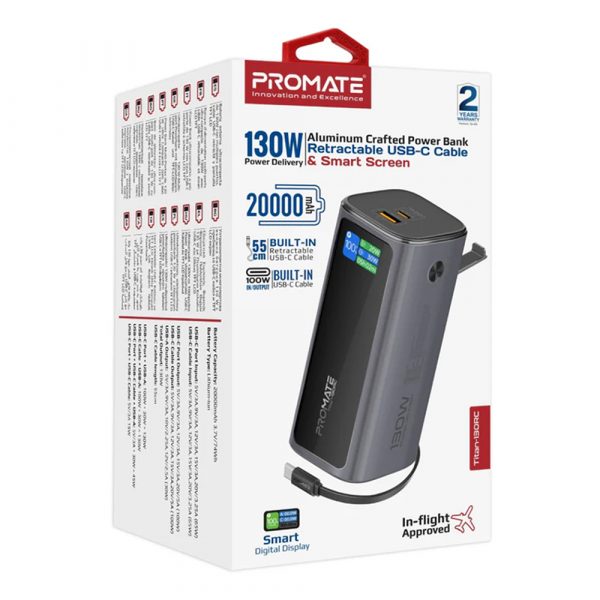 Step into a world of unparalleled power with Promate’s Titan-130RC, the ultimate charging companion crafted for those who demand more. Boasting a massive 20000mAh capacity and a 130W total output, this power bank charges all your devices at breakneck speeds. The USB-C™ Power Delivery port and built-in retractable USB-C cable ensure seamless charging, while the 30W Qualcomm QC 3.0 port adds versatility. Designed with a sleek metal construction and featuring an integrated smartphone stand for added convenience, it’s a perfect blend of function and style. The vibrant TFT LCD display keeps you informed, while advanced overcharging and overheating protection ensure safety. Whether you’re at home, in the office, or on the move, Promate Titan-130RC delivers rapid power and unprecedented versatility.