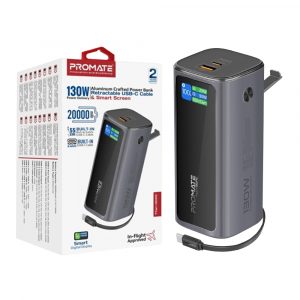• ” High-Capacity 20000mAh Battery 130W Total Output Super-Fast PD100W USB-C Port Built-in Retractable PD100W USB-C Cable Premium Quality 30W USB-A Qualcomm QC 3.0 Port Convenient Built-in Mobile Stand Resilient and Sleek Aluminum Metal Construction Safety and Multi-Protection System in Place Engineered with Smart TFT LCD Display TFT LCD Colour Display with Multifunction Button Control Universal Compatibility”