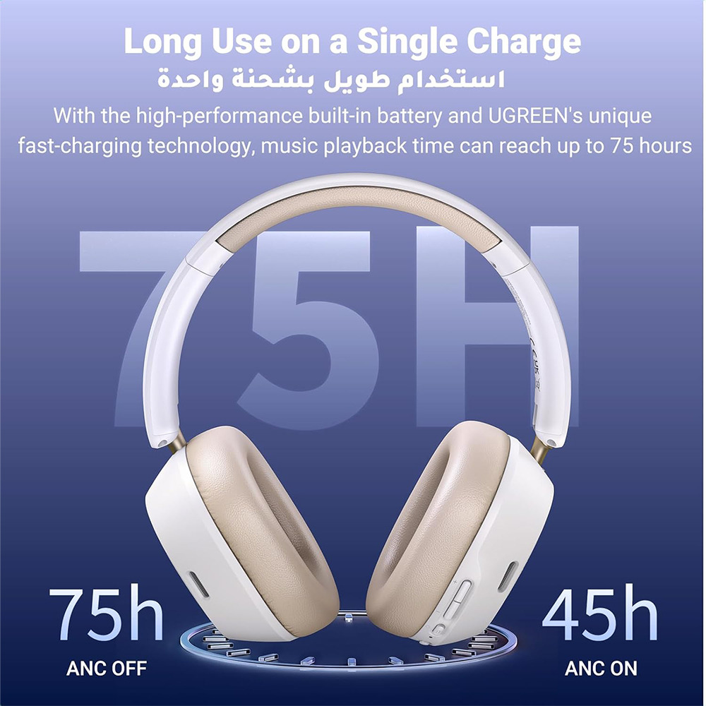 • 【Ultra-long Battery Life & Fast Charging】The over-ear headphones can be fully charged in just 1.5 hours. With long battery life (45 hrs-ANC Off, 75 hrs-ANC On), UGREEN headphones can be used for a week after a single charge in case of frequent use and even for two weeks in case of casual use. With just 5 minutes of charging, the earphones can be used continuously for 5 hours.